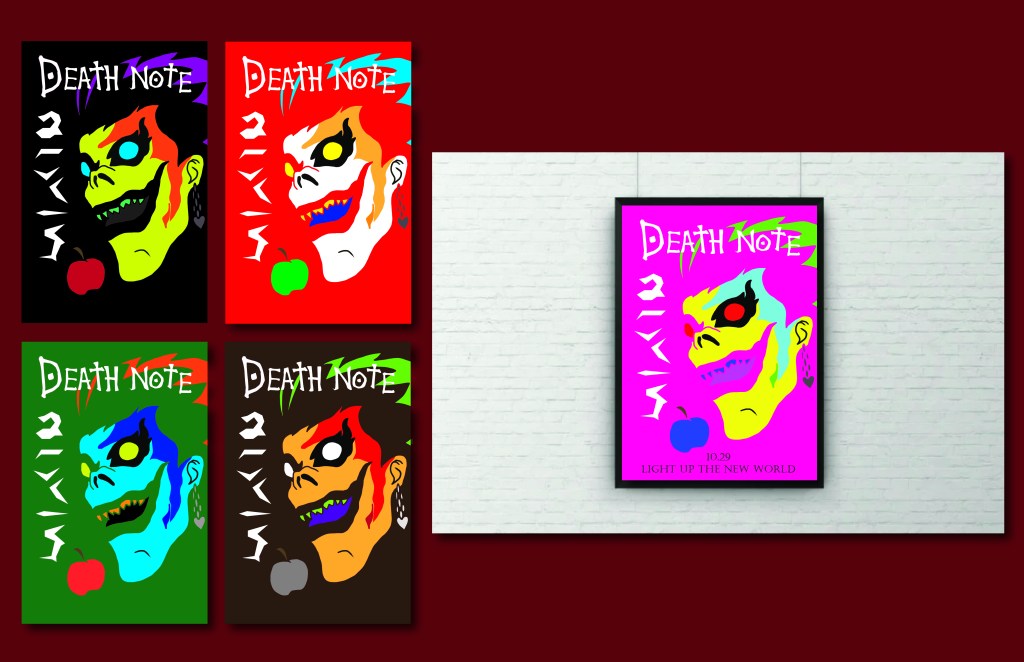 This was a project from my Graphic Comm 2 class at CCAC where we had to design our own posters for an existing TV show/Movie. I chose the anime “Deathnote” as it is my favorite anime, and I chose to do a sort of pop art style to contrast the darker grey tones of the actual series. This project was practice for us using colors and drawing shapes to create interesting graphics. I also included a few different color variations. Software used: Adobe Illustrator.