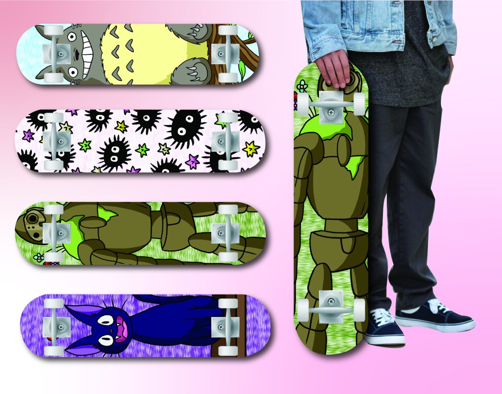 This spread contains skateboard designs I drew containing real existing characters from some of my favorite Studio Ghibli films. I love Studio Ghibli as well as skateboarding, and so do many people in my age demographic. I redrew the characters myself to give the designs a more personal stylized feel. The purpose of this project was to practice my drawing style and demonstrate it on merchandise/products. Software used: Krita and Adobe Illustrator.