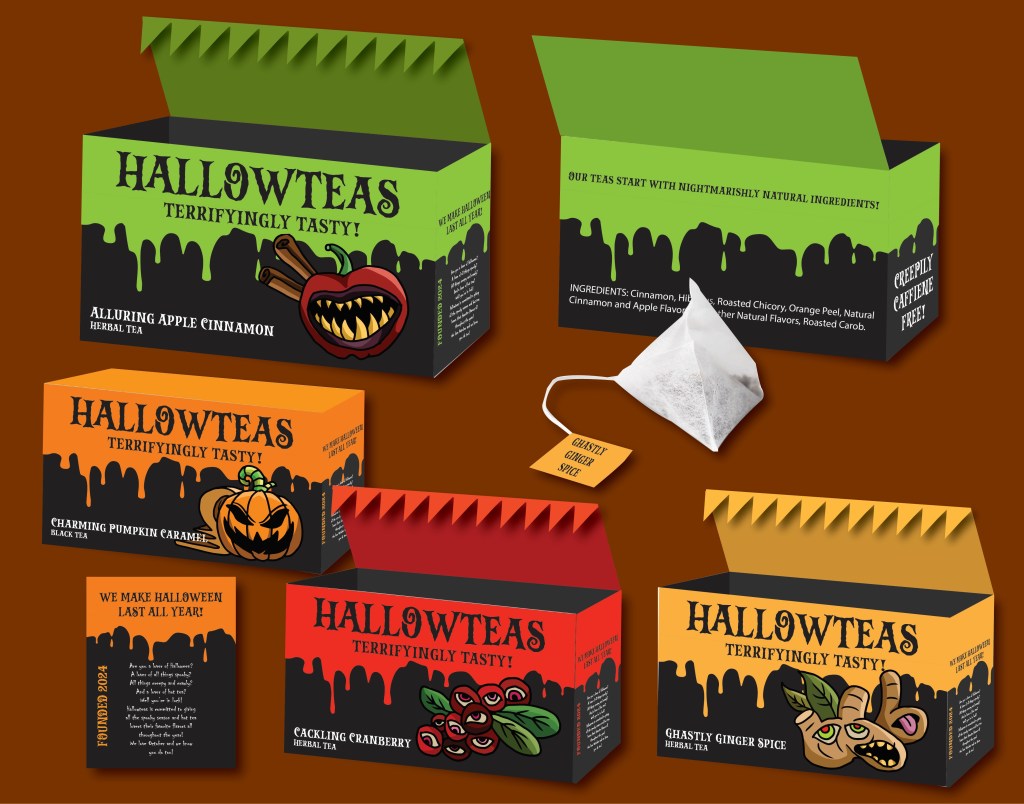 This is my imaginary tea brand I created for lovers of both Halloween and hot tea. I myself enjoy both Halloween and hot tea very much, and the reason I created this spread of products is because I know a lot of other people do too, especially those in my age demographic and older. The graphics are all drawn by me and the purpose of this project was to better my skills at creating products and labeling. Software used: Krita and Adobe Illustrator.