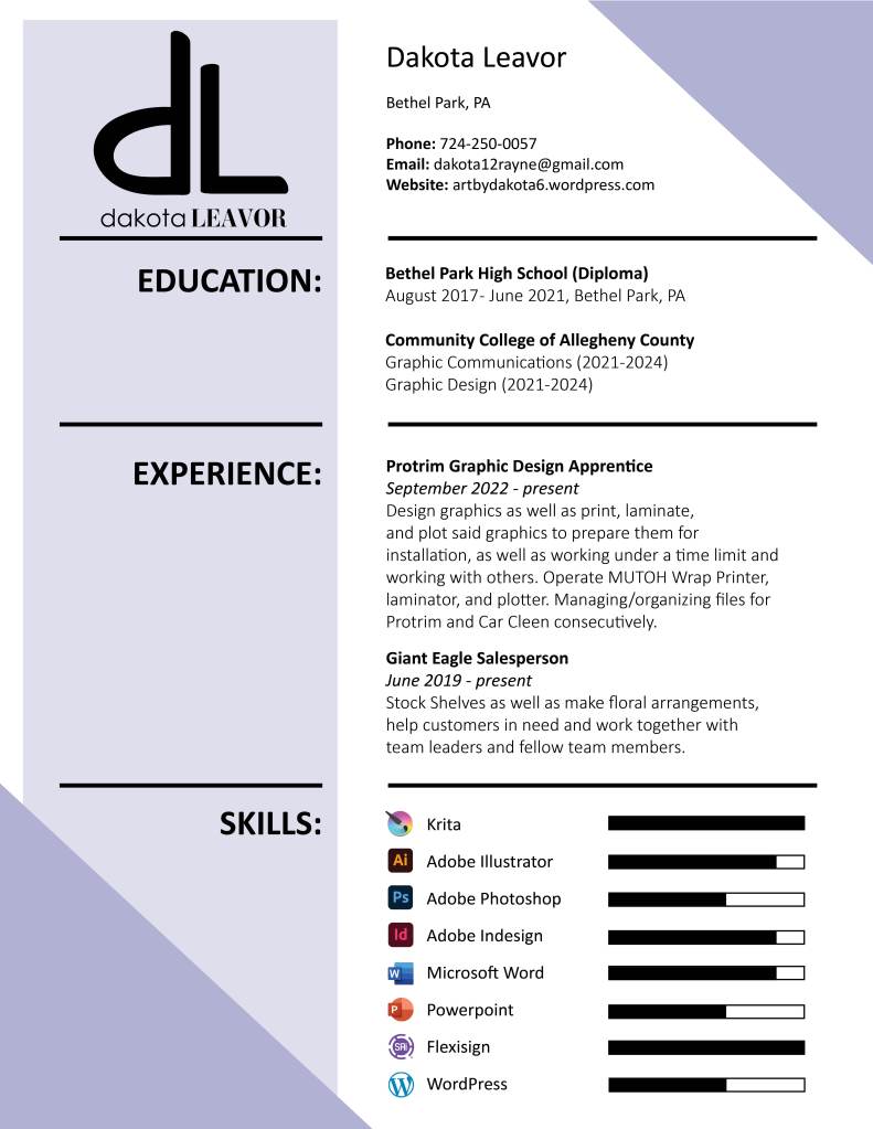 My name is Dakota Leavor, and I am a 21 year old Graphic Designer from Bethel Park, Pennsylvania. I have been drawing since I was around 4 years old. Art has always been a very important part of my life, I am always creating whether it’s pencil on paper, markers, colored pencil, pens/inking, my digital drawing tablet, or even jewelry making. While I mostly like drawing people and characters, I am also skilled in designing other graphics as well, such as logos for businesses, wraps for vehicles, labels for products, and more. I enjoy creating almost anything, and especially enjoy things with a lot of bright colors and bold imagery. I have been a graphic design student for nearly 3 years, a graphic design apprentice for 2 years, and I plan on always creating and being a graphic designer for the rest of my life. I am skilled in working both with others or independently. Graphic Design and art in general is something I am extremely passionate about, and always will be. I am always ready to design anything I am asked to, challenge or simple project. I hope you enjoy looking at my page!